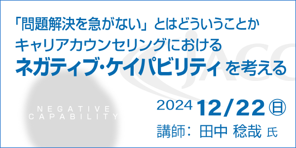 社会はVUCAの時代と言われ、多様性の尊重における利益相反が起こり、AIをはじめとする技術革新が進み、ますます先が見通しにくくなっています。キャリア支援の領域でも相談者が「答え」を見つけるのは容易ではありません。そこで、あらためてキャリア コンサルタントにとっての「相談者理解」「問題解決」「相談者の役に立つ」について、ネガティブ・ケイパビリティの視点から考えてみたいと思います。ネガティブ・ケイパビリティとは何かはもちろん、ネガティブ・ケイパビリティと共感力や創造性との関連についても触れたいと思います。実際の事例を基に作成したワークとネガティブ・ケイパビリティを意識したロールプレイなどグループワークで行ない感想の共有を行う予定です。